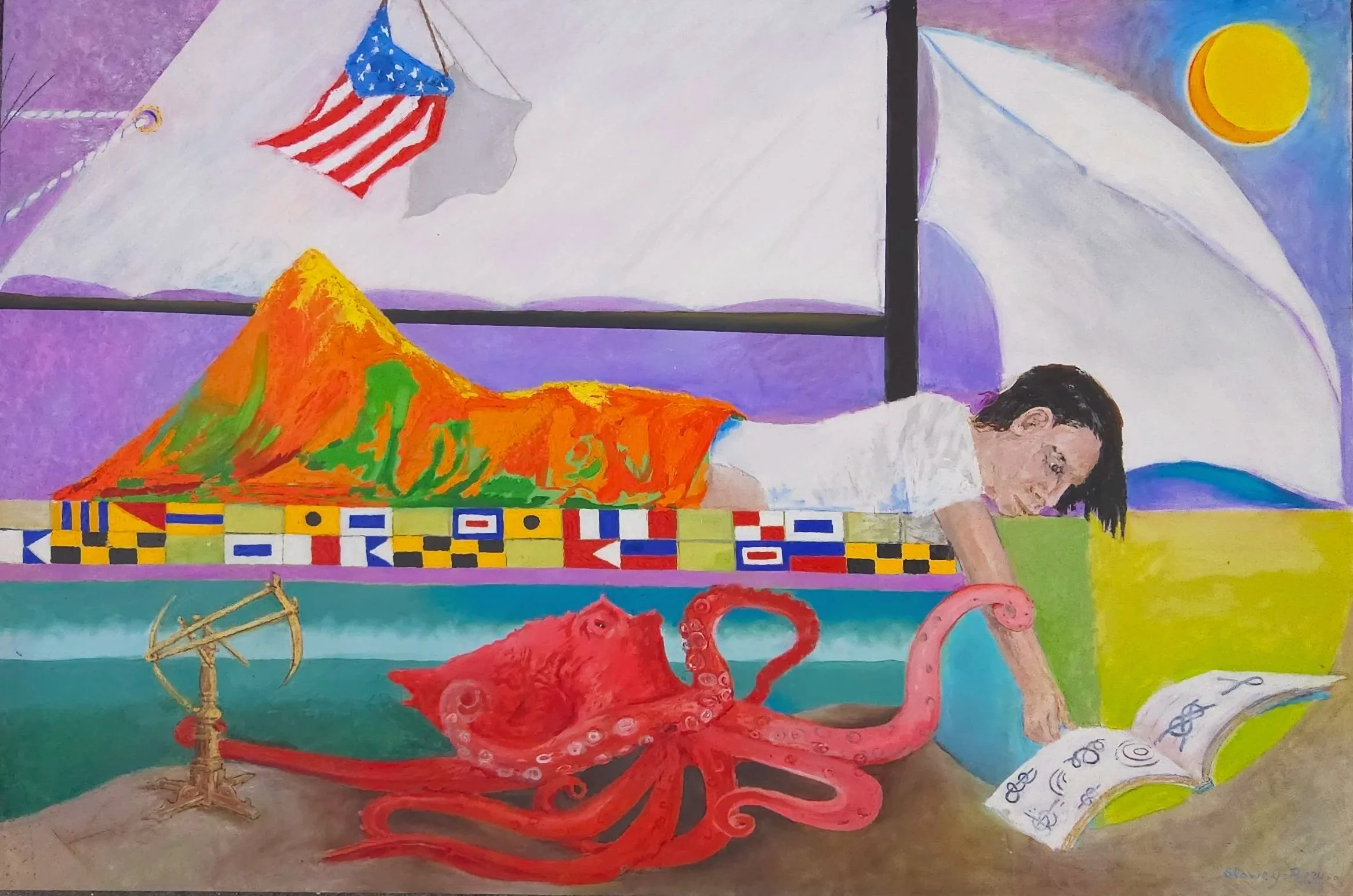 The landscape holds its breath, from the distant mountain cabin to the waterfalls tumbling into the ground. Watching it all are eight bees—sculptural, three-dimensional forms buzzing with the tension of the moment. They are the only ones witnessing the full extent of the Fool's folly. He is not just unaware of the cliff, he is unaware of his own exposure. True to the bawdy humor of the original 14th-century cards, he is fully revealing himself—a detail painted so subtly that it blends into his coat until the moment you notice it, after which it becomes impossible to unsee.