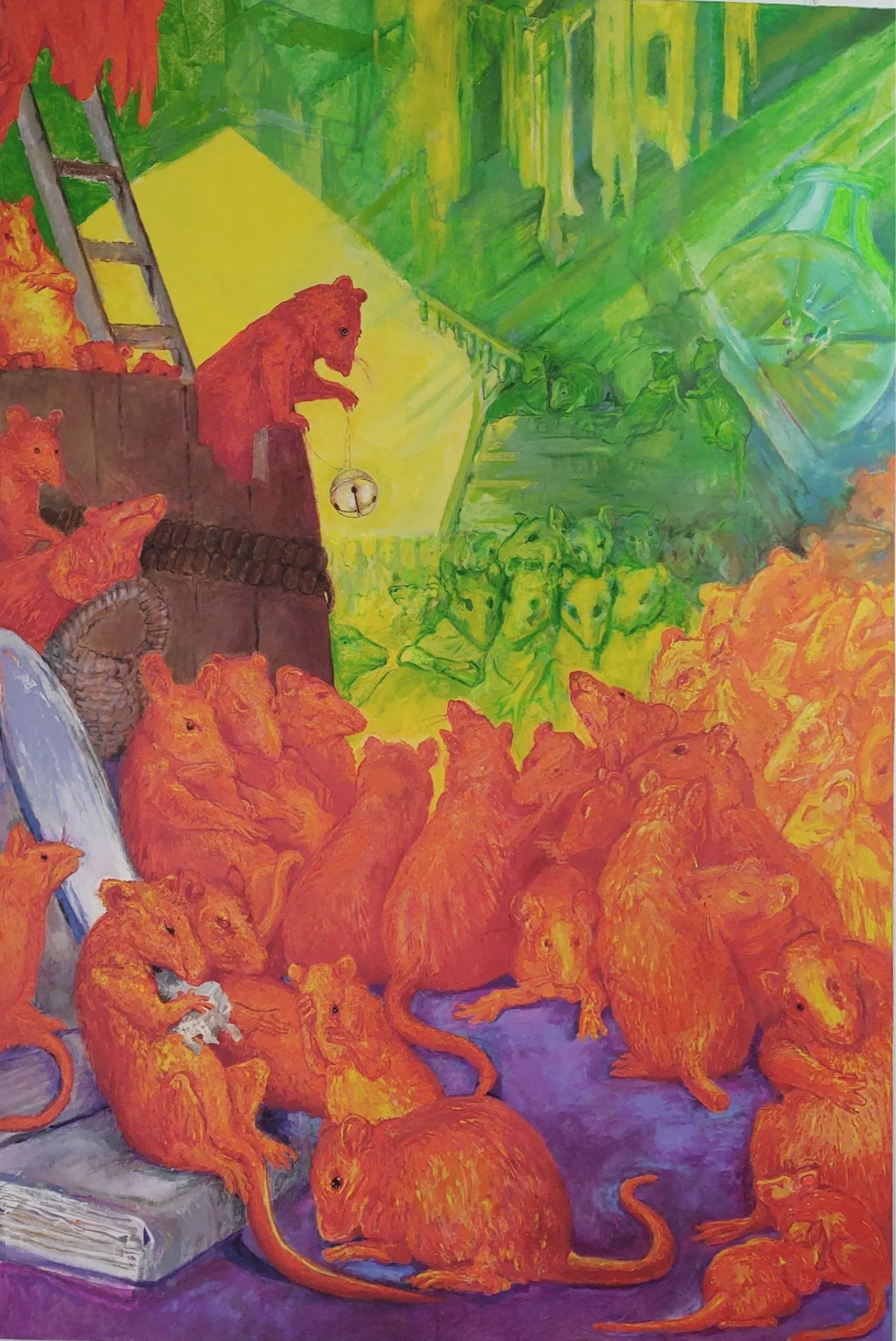 Belling the Cat, Aseop. 2024. Oil on canvas, 72 x 48 inches